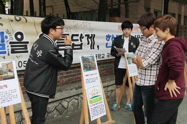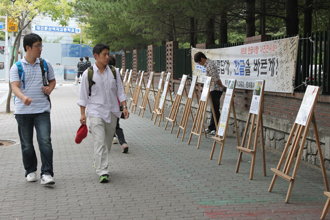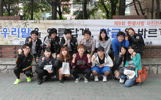 오는 9일 566돌을 맞는 한글날을 앞두고 목원대(총장 김원배) 사범대학 국어교육과(지도교수 표언복) 교수와 학생들이 아름다운 우리말을 시민들에게 알리는 ‘한글사랑 사진전시회’와 거리 홍보전을 펼쳤다. 이들은 지난 5일부터 7일까지 대전 서구 둔산동 둔산여고 네거리와 향촌아파트, 갤러리아 타임월드 일대에서 ‘우리말을 아름답게, 한글을 바르게!’라는 주제로 ‘제9회 한글사랑 사진전시회’를 열었다. 사진은 사진전시회를 진행하고 있는 목원대 학생들의 모습.
