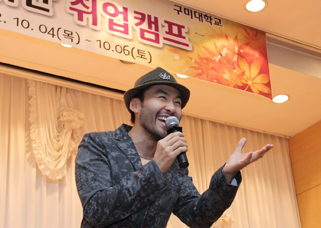 구미대(총장 정창주)가 지난 4일부터 6일까지 충북 단양 대명리조트에서 재학생 500여 명을 대상으로 대규모 실전형 취업캠프를 개최했다. 교육역량강화사업의 일환으로 마련된 이번 ‘2012 핵심인재 양성을 위한 취업캠프’는 학생들에게 최신 취업트랜드와 취업 정보를 제공하고, 전공에 맞춘 세부 취업전략 수립・실전훈련을 실시했다. 캠프는 2박3일간 입사서류 마스터, 면접스킬 마스터, 실전면접 마스터로 나누어 ▲입사지원서 작성법 및 학과계열별 맞춤 특강 ▲면접 이미지 메이킹과 스피치 기법 ▲자기소개서 및 이력서 작성 실습 ▲인사담당자와의 실전 모의면접 등 맞춤형 취업지도로 진행됐다. 특히 5일에는 인기 방송인 노홍철 씨를 초청해 ‘긍정의 힘’이란 주제로 학생들에게 웃음과 더불어 꿈과 희망을 심어주는 특강도 마련해 학생들의 큰 호응을 얻었다. 사진은 특강을 진행 중인 노홍철 씨(상)와 모의면접을 진행하고 있는 구미대 학생들의 모습(하).