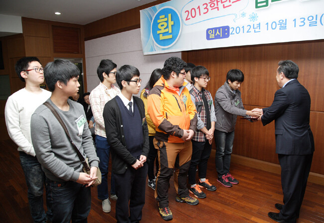 '가능성을 지닌 우수 이공계 인재들에게 집중투자'하는 취지로 영진전문대학(총장 최재영)이 올해 도입한 입도선매 전형이 수시1차 모집을 성공적으로 마무리한 가운데 지난 13일 합격자 28명과 학부모 31명을 초청, 오리엔테이션을 가졌다. 이날 대학을 방문한 학생과 학부모들은 대학 현황과 입도선매 교육 과정에 대한 소개를 받고, 교수들과 함께 대학 시설을 둘러봤다. 특히 이들은 2013학년도에 입학해 생활한 공간인 칠곡캠퍼스에 큰 관심을 보였다. 새롭게 조성된 첨단 교육환경과 신축된 기숙사 시설을 꼼꼼히 살펴보면서 매우 만족해하는 분위기였다. 영진전문대학은 입도선매 과정 입학생들에게 학업에만 열중할 수 있도록 등록금 전액 면제와 최신식 기숙사 무료 제공 등 파격적인 지원을 펼칠 예정이다. 특히 소수 정예화된 글로벌 톱클래스(Top Class) 환경에서 교육을 받도록 학생들은 '기숙형 사관학교'식으로 교수 1명이 재학생 5명을 담당하도록 한다. 사진은 칠곡캠퍼스를 둘러보는 학생들의 모습과 오리엔테이션의 모습.