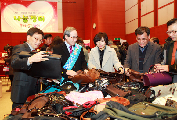 전북대(총장 서거석)가 13일 오전 11시부터 ‘2012 전대 나눔장터’를 개최한다. 매년 실내에서 진행했던 행사를 올해는 규모를 키워 소운동장에서 열기로 했다. 더 크게 행사의 장을 마련하고 지역민들의 많은 참여도 유도하기 위한 것. 이번 나눔 장터를 위해 전북대는 11월 9일까지 전 구성원을 대상으로 의류와 가전, 도서, 아동용품, 잡화 등의 물품을 기증받았고 현재 4천여 점이 넘는 물품이 모였다. 또한 장터에서 사용할 수 있는 1만 원 권 나눔 쿠폰을 판매하고 수익금 전액은 연말 어려운 이웃들을 위해 소중히 쓰일 예정이다. 사진은 지난해 전북대에서 개최한 나눔장터 모습.