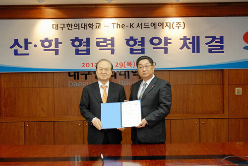 대구한의대(총장 이준구)와 The-K 서드에이지(주)는 지난 29일 대학본부 회의실에서 이준구 총장과 손승일 대표이사를 비롯해 업무관계자 10여 명이 참석한 가운데 산학협력 협약을 체결했다.