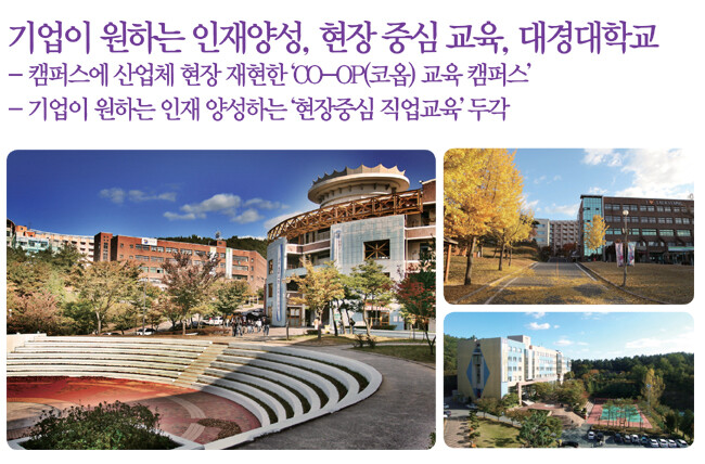 대경대학교는 국내대학 최초로 캠퍼스 내 현장 직업교육인 ‘CO-OP(코옵) 시스템’을 도입하여 ‘취업 걱정없는 특성화 교육 대학’으로 자리매김하고 있다. 이 대학의 38개 학과는 산업체 현장과 동일한 수업현장에서 전공 이론 및 실습교육을 제공하고 있다.