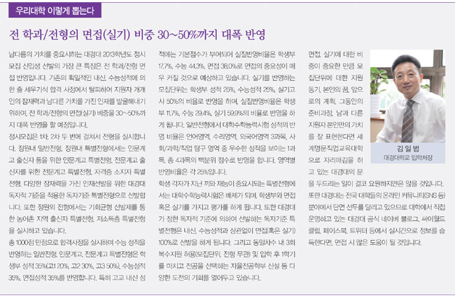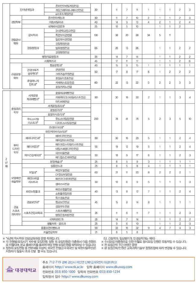 대경대는 ‘남다른 인재 양성’을 골자로 지역최초로 예체능 계열 학과에 ‘스타 교수제’를 도입했다. 실력파 예능인 김쌤 김홍식 교수, 나가수로 파워 보컬을 인정받고 있는 소찬휘 교수, 인기 드라마 제조기 이재규 교수가 대경대 강단에 오른 것. 이러한 전문가의 현장교육으로 예·체능 학과가 두각을 나타내면서 대경대는 예술, 문화 특성화 대학으로서 입지를 구축했다. 철저한 실무중심 캠퍼스 교육 적용으로 재학생의 48%가 수도권 지원자로 해마다 수도권 지원자 수가 강세를 보이고 있다.