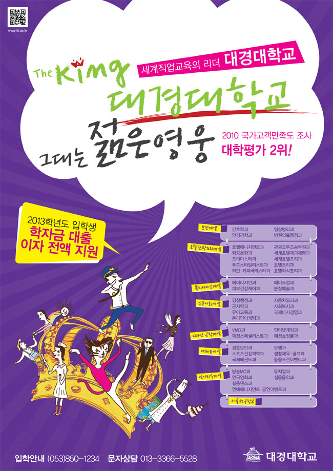 1997년에는 전국 대학 최초로 뮤지컬과를 개설해 대구, 경북지역의 예술문화 부흥 및 지역 뮤지컬 인재양성 교육을 이어나가고 있다. 특히 국내 최대 뮤지컬 축제인 ‘대구국제뮤지컬페스티벌’ 대학생 부문에서 금상을 수상해 대내외적으로 이 대학 뮤지컬학과의 전공전문성을 인정받은 바 있다. 대경대의 국내 유일학과 개설은 성공적인 직업 특성화 교육환경을 마련하는 발판이 됐다. 이 대학은 사회 직업 변화에 따라 ‘크루즈승무원학과’, ‘자동차딜러과’, ‘동물조련이벤트과’를 잇따라 개설하고, 해당 산업체와 교육, 취업 협약을 통해 각 분야의 전문 직업인을 배출하고 있다. 이에 따라 캠퍼스 환경이 취업과 직결되는 관광크루즈승무원과의 경쟁률은 수직 상승률을 기록하고 있다. 크루즈 승무원과에 대해 김일범 입학처장은 “해외 노선인 크루즈 선상에서 한 달 동안 실습을 거친 뒤 ‘졸업 전 선 취업’이 가능해 전공자들은 전문성만 인정받으면 취업으로 바로 이어지고 있어 취업에 유리한 학과”라고 전망했다.