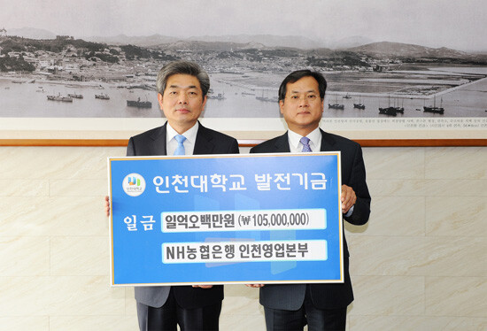NH농협 인천영업본부 전경진 부행장은 31일 인천대를 방문해 1억 500만 원의 발전기금을 전달했다. 전 부행장은 “지난 3년간 1억 원씩 발전기금을 기탁해 왔으며 앞으로도 인천대가 지역거점 대학으로 도약하는데 힘이 될 수 있도록 사회적 은행으로 함께 노력해 나갈 것”이라며 “학생들을 위한 장학사업, 교육ㆍ연구 시설 확충 등에 도움이 됐으면 좋겠다”고 밝혔다.