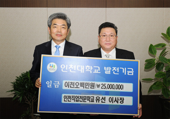 또 같은날 인천직업전문학교 유선 이사장도 최성을 인천대 총장을 만나 국립대학법인으로 새롭게 출범한 인천대의 발전을 위해 써달라며 2500만 원의 발전기금을 전달했다.
