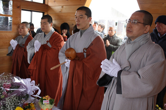 우리나라와 일본, 독일, 영국, 스리랑카의 불교학자를 중심으로 한 종교학자들이 2011년 일본 동일본 대지진의 피해지역인 이와테현(岩手県)히라이즈미쵸(平泉町) 및 리쿠젠타카타(陸前高田)시를 방문해 지진피해자들에 대한 추모와 세계평화를 기원하는 마음을 전했다. 동국대학교(총장 김희옥)와 일본 국립대학법인 사이타마대학(埼玉大学)(학장 가미이 요시히코(上井 喜彦))은 1월 22일과 23일 이틀간 일본 사이타마현에서 공동으로 주최한 국제 심포지엄이 끝난 후 참가 패널리스트와 대학관계자 등 20여 명이 지진피해지역을 찾았다. 이들은 24일 일본 동북지방 불교의 거점이며, 영구평화를 희망하는 ‘정토(淨土)의 땅’인 히라이즈미쵸(平泉町)의 중존사(中尊寺)와 모월사(毛越寺)를 방문해 동일본 대지진 희생자 공양을 위해 세워진 불상 앞에서 희생자들을 추모했다. 25일에는 지진 당시 피해가 가장 컸던 지역 중의 하나인 리쿠젠타카타(陸前高田)시를 방문해 피해자들을 위한 피해지 부흥을 기원하는 마음을 담아 한국불교식으로 진혼의식을 진행했다. 사진은 진혼의식을 진행하고 있는 종교학자들의 모습.