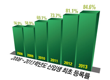 이는 지난 2012학년도 최초 등록률 81.06% 보다 3.54% 포인트 높아진 것으로 건국대의 신입학 최초등록률은 지난 2008년 이후 5년 연속 상승하고 있다.