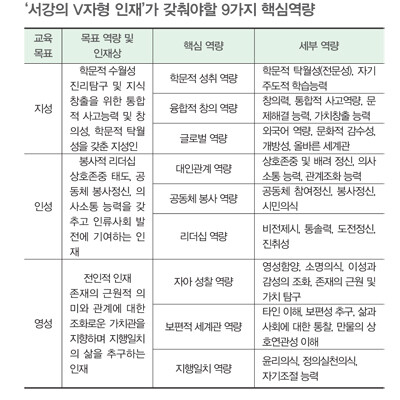 전인교육원, “‘지성’. ‘인성’. ‘영성’ 겸비한 인재 양성” 서강대는 ACE 사업 일환으로 2011년 7월 전인교육원을 설립했다. 글쓰기센터, 학사지도교수상담실, 기초교육원, 전인교육원, 교수학습 센터 등으로 구성된 전인교육원은 지성(Veritas), 인성(Virtue), 영성 (Venerability)을 겸비한 이른바 ‘서강의 V자형 인재’를 양성하는 중추적 역할을 맡고 있다. 심종혁 교학부총장 겸 전인교육원장은 “융복합 시대에 필요한 통섭적 사고와 자기주도적 학습역량이 중요해졌다”며 “전인교육원을 통해 총체적 학부교육 선도체계 구축을 완성할 것”이라고 말했다. 이를 위해 서강대는 9가지 핵심 역량을 바탕으로 ACE 사업 과 관련된 교육 프로그램을 펼치고 있다.