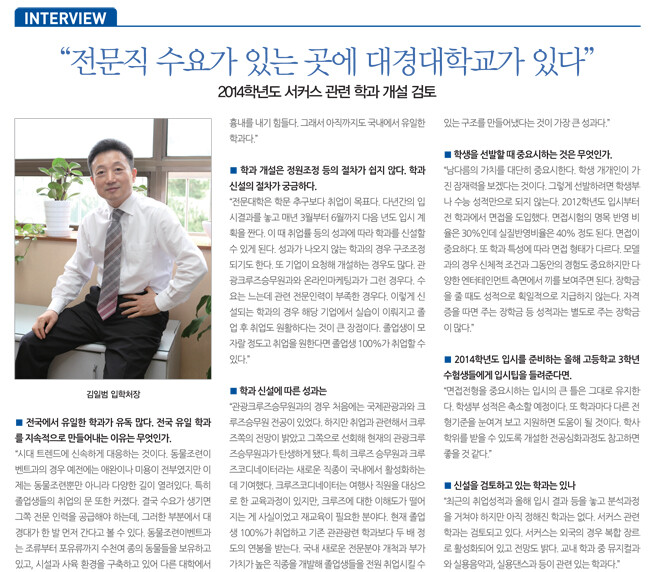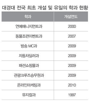 대경대의 국내 유일학과 개설은 성공적인 직업 특성화 교육환경을 마련하는 발판이 됐다. 이 대학은 사회 직업 변화에 따라 ‘크루즈승무원학과’ , ‘자동차딜러과’ , ‘동물조련이벤트과’를 잇따라 개설하고, 해당 산업체와 교육·취업 협약을 통해 각 분야의 전문직업교육의 장을 마련했다.