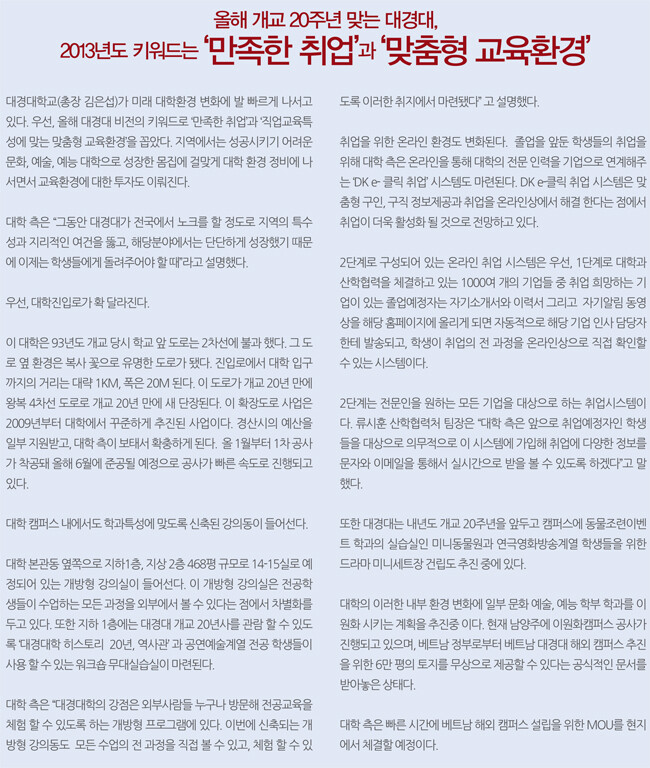 주인공은 지난 1993년 문화와 예술 예능분야 특성화를 내걸고 개교한 대경대학교다. 전국 유일의 학과들을 잇따라 개설하면서 새로운 취업군을 개발하고 고소득 전문직 졸업자를 배출하고 있는 대경대학교의 진면목을 들여다본다.