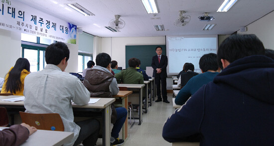 김 시장은 특강에서 제주경제의 FTA의 중요성을 강조하면서 경제 분야의 전문성을 높이기 위해 앞으로 수행해야 될 과제와 학생들의 졸업 이후 진출방향에 대해 조언을 아끼지 않았다.
