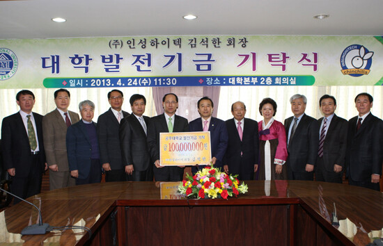 김석한 회장은 이날 서만철 총장과 만남의 시간을 갖고 “글로벌 시대를 선도하는 공주대 학생들의 학업향상과 면학분위기 조성에 도움이 되길 바란다”고 말하며 기금을 전달했다.