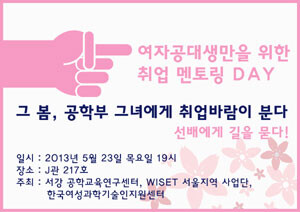 이번 행사는 공학부 공학교육연구센터가 한국여성과학기술인지원센터와 WISET 서울지역사업단의 지원을 받아 진행하는 행사로, 서강대 공학부에 재학 중인 여학생과 취업한 여성 졸업생이 만나 취업·경력개발 및 직장생활 노하우를 공유하는 자리로 마련된다.