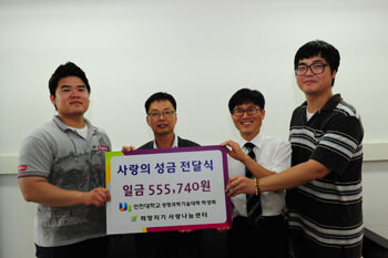 생명과학기술대학 학생회는 지난 4월부터 수업이 없는 시간을 이용해 4∼6명의 학생들이 수시로 교내 길거리 공연을 통해 모금 운동을 펼쳤다. 이날 학생회가 전달한 성금은 난치병 어린이와 소외된 어린이를 돕는 데 쓰일 예정이다.