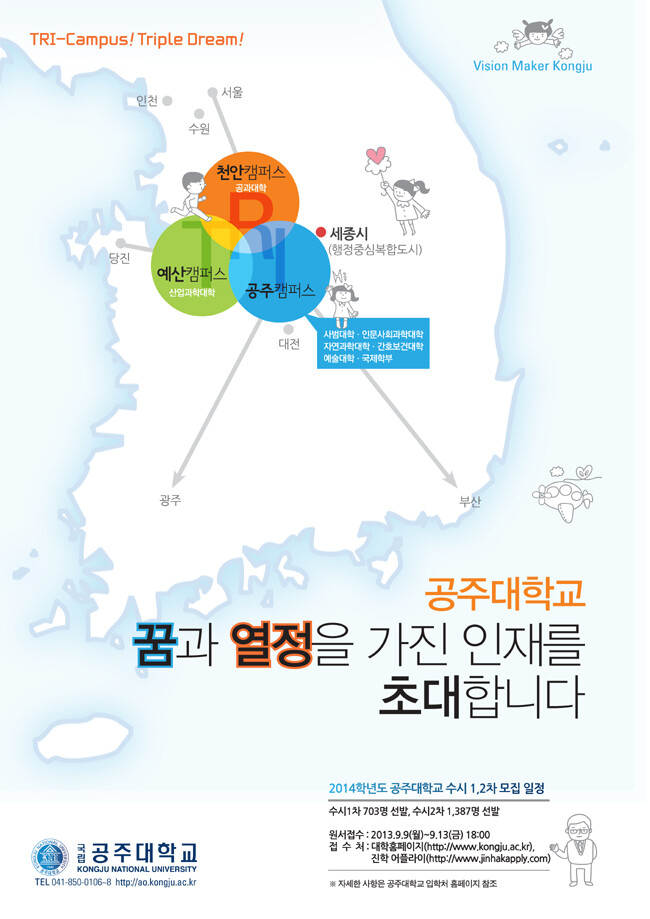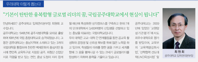 충남 유일의 국립대학교인 공주대학교의 발전이 눈부시다. 1948년 공주사범대학으로 출발해 65년 역사의 전통 있는 대학이다. 공주대학교는 공주-천안-예산 3개의 캠퍼스와 7개 단과대학, 일반대학원과 특수대학원을 갖추고 2만2,000여 명 규모의 국립 거점 종합대학교로 발돋움하고 있다. 특히 사범대학으로 출발한 전력을 뽐내며 서울과 경기 인천 등 수도권 학생들이 주목하는 대학이기도 하다. 실제로 최근 공주대 사범대 신입생 중 약 절반 정도가 서울과 경기, 인천지역 등 수도권 출신이다. 종합대학 역사만 보면 전국 국립대 가운데 가장 빨리 성장한 대학인 셈이다. 공주대학교는 외형적으로는 국립대 중 7번째 규모를 자랑한다. 공주-천안-예산의 삼각캠퍼스는 캠퍼스별 명확한 특성화를 통해 발전가능성이 매우 크다. 공주캠퍼스는 전통적인 사범대를 필두로 인문·사회·자연과학·간호보건·예술 등의 분야에서 강하다. 천안캠퍼스는 천안 산업단지와 연계한 공과대학의 발전가능성이 크고, 예산캠퍼스는 예산·홍성의 내포신도시를 연계하는 농·생명과학분야에서 강점을 드러내고 있다.