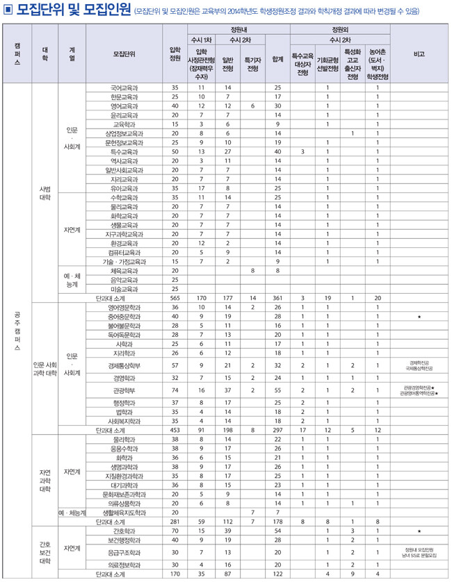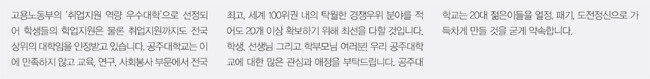 특히 세종신도시에서 차로 10분 거리에 있는 공주캠퍼스의 경우 향후 공공정책 분야 등에서 관학 연계의시너지 효과도 기대된다. 아울러 우수한 교육과 저렴한 등록금으로 수험생들의 관심을 끌고 있다. 실제로 2013년 인문사회계열은 161만5,200원, 자연과학계열은 193만1,500원, 공학계열은 211만9,000원, 예체능계열은 208만5,800원이다.(1학기 기준) 또한 공주대는 최근 각종 정부지원사업에 선정되면서 특히 주목을 받고 있다. 올해 교육역량강화사업에서 매우 높은 평가를 받았고, 산학협력선도대학육성사업(LINC)에도 선정되는 등 겹경사를 맞았다. 이밖에 ‘대학청년고용센터 민간위탁운영기관 선정(고용노동부)’, ‘대학취업지원 역량 인증제’ 취업지원 우수대학 선정(고용노동부) 등 취업에서도 강한 대학의 면모를 과시하고 있다. 2012년 장학금 수혜율이 77.4%(연간 1인당 112만9,200원)에 달하고 4,300여 명을 수용할 수 있는 첨단시설의 학생생활관도 주목할 만하다. 이밖에도 학내에서는 맞춤형 교육, 담임교수제, 종합인력개발원의 커리어 관리 등의 대학 본부 차원의 다양한 취업지원이 가동 중이다.