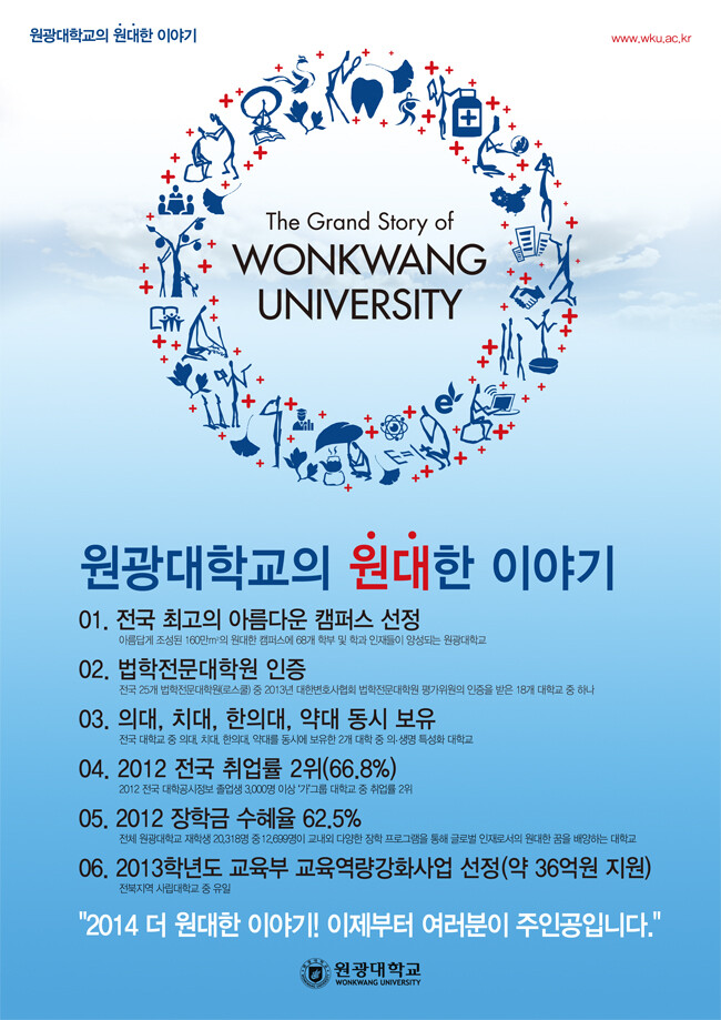 원광대학교는 도덕대학을 기본으로 내세우고, 학생을 우선으로 생각하는 대학으로서 미래가 보장되는 대학생활을 위해 오늘도 대학의 모든 구성원들이 최선을 다하고 있으며, 아시아 최고의 인문융합 생명존중대학을 목표로 인문학적 소양강화/의·생명/중국문제/그린에너지 등 4대 특성화를 내세워 새로운 도약의 전기를 마련했다. 특히 4대 특성화는 학생들을 전문지식뿐만 아니라 인문학적 소양과 국제적 감각을 갖춘 인물로 양성하기 위한 프로그램이다. 아울러 의·생명 및 중국문제 특성화는 새로운 발전 모델을 창출해 세계와 호흡하는 인재로 키우고, 이를 통해 학생들의 취업경쟁력을 키울뿐만 아니라 지역사회와 대한민국, 나아가 국제적 인물로 성장 발전시키는 것을 목표로 하는 프로그램이다.