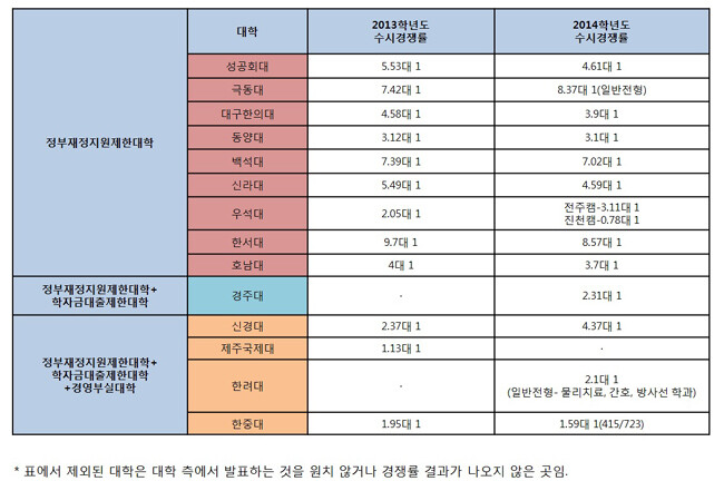 정부재정지원제한대학, 학자금대출제한대학, 경영부실대학에 선정된 이른바 하위 15% 대학들의 올해 수시모집 경쟁률이 대부분 지난해에 비해 하락했다. 하지만 하락폭이 1~2% 수준에 불과하거나 경영부실대 가운데 경쟁률이 오히려 상승한 대학도 있었다.