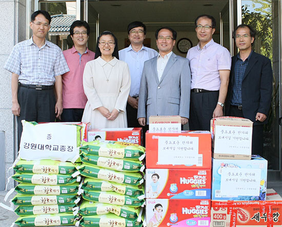 원준호 대외협력팀장 등 강원대 교직원들은 신승호 총장을 대신해 지난 16일 춘천 시내 미혼모 보호 복지시설인 '마리아의 집'을 방문, 햅쌀 25포 등 위문품을 전달했다. 또한 노인복지시설 '보배로운 집'과 장애인복지시설 '애호의 집'에도 각각 쌀 10포씩을 전달했다.