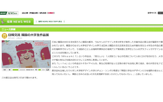 후쿠오카 NHK-TV는 전시 첫날인 지난달 26일 당일 오후 6시 뉴스를 통해 ‘일한교류 한국의 대학생 작품전’을 제목으로 울산대 디자인대학의 졸업작품전을 자세히 소개했다.
