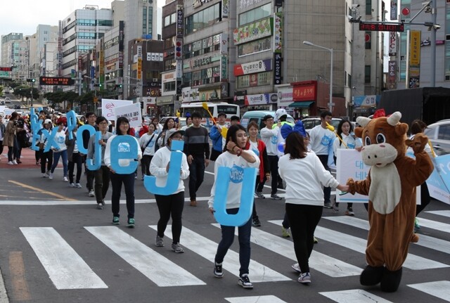 출범식 후에는 ‘유니브엑스포 제주’ 기획단, 서포터즈 및 참여단체 등이 참여하는 남광초등학교~제주시청광장까지 길거리 퍼레이드도 진행됐다. 퍼레이드에는 제주경찰악대, 제주교대 사물놀이패도 함께 했다.