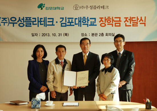 (주)우성플라테크 허남선 대표이사는 31일 사회복지과에 재학 중인 조정자 씨에게 장학금 300만 원을 전달했다.