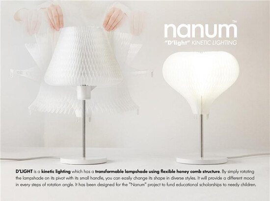 딜라이트는 donative(기부금)와 light(빛)의 합성어로 ‘delight’의 사전적 의미인 ‘큰 기쁨을 준다’는 뜻을 갖고 있다. 하트 형태의 전등갓 끝부분을 잡고 회전시키면 형태가 다양하게 변하는데 이를 통해 밝기를 조절할 수 있다. 전등갓이 하트 모양일 때 가장 밝아 나눔의 마음이 세상의 소외된 곳을 밝힌다는 상징적인 의미를 담았다고 연구팀은 전했다.