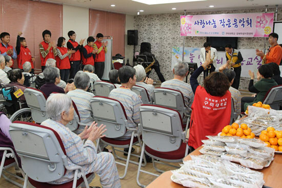구미대 장애학생지원센터(센터장 김기홍) 소속 학생 10명은 12일 구미시립노인요양병원(병원장 이택근)을 찾아 색소폰 연주와 노래, 체조와 안마 등으로 어르신들과 즐거운 시간을 가졌다.