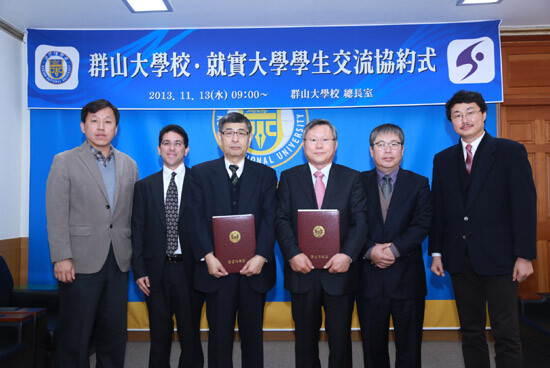 군산대는 13일 교내 본부에서 학생교육협력에 대한 협약식을 개최했다. 협약식에는 채정룡 총장, 히데오 이나바 총장을 비롯해 군산대 김계태 국제교류교육원장, 슈지츠대 Laurence Dante 국제교류센터장, 가종수 교수 등이 참석했다.