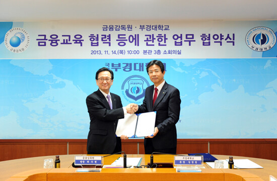 14일 부경대를 방문한 금융감독원 최수현 원장은 김영섭 총장과 금융교육 협력 등에 관한 업무 협약을 체결했다. 금융감독원이 부산지역 대학과 협약을 체결한 것은 이번이 처음이다.