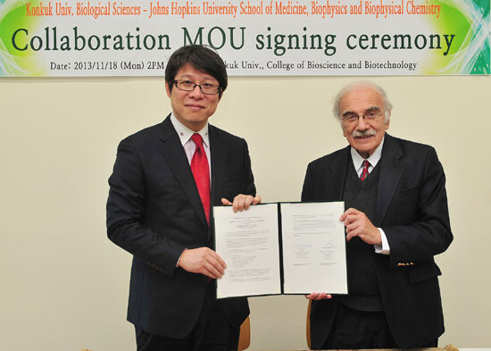 이번 협약에 따라 건국대 생명특성화대학과 존스홉킨스의대 생물리 생화학과는 단백질, 조효소, 핵산 등 분자 수준 바이오 연구와 줄기세포를 이용한 신약 개발에 관한 공동연구를 진행하게 된다.