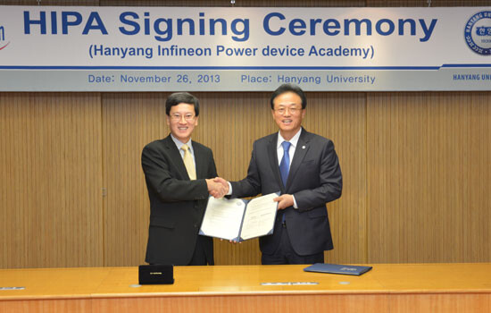 한양대는 26일 교내 신본관에서 인피니언 테크놀로지스(코리아 대표이사 이승수)와 전기차용 전력반도체 전문인력 양성을 위한 아카데미 설립 협약을 체결했다.