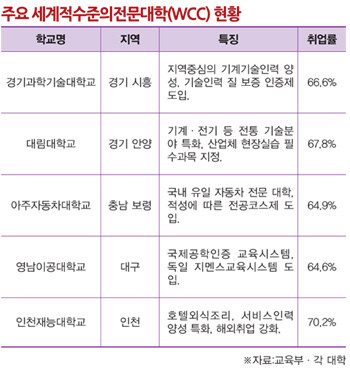 아주자동차대는 국내 유일의 자동차전문 기술인력 양성 대학으로서 자기적성에 따라 전공을 바꿀 수있는 ‘전공코스제’를 도입하는 등 특징적인 교육프로그램으로 경쟁력을 높여오고 있다. 올해 WCC로 선정된 대림대와 인천재능대의 경우 각각 기계·전기 등 전통적인 전문기술 분야와 호텔·외식 등 서비스 인재 배출에서 특성화에 성공했다는 평가를 받는다. 대림대는 전체 학과에 대한 산업체 현장실습을 필수과목으로 지정하는 등 현장실무 역량강화에 역점을 둔 교육과정을 운영하고 있으며 각종 정부지원사업과 연계한 취업경쟁력 강화 프로그램이 눈에 띈다. 인천재능대의 경우는 서비스 분야 맞춤 교육과 아울러 ‘해외현장 및 외국어 연수 프로그램’을 운영하는 등 해외취업에 강한 차별화된 프로그램이 좋은 평가를 받고 있다.