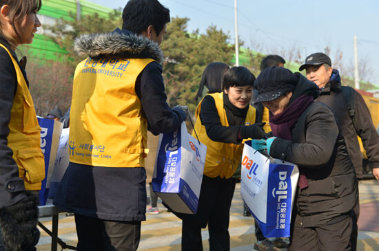 봉사단원들은 사회복지법인 다일복지재단과 함께 한 이날 '거리성탄예배'에서 방한 점퍼와 도시락 등을 노숙인과 무의탁노인들에게 전달했다.
