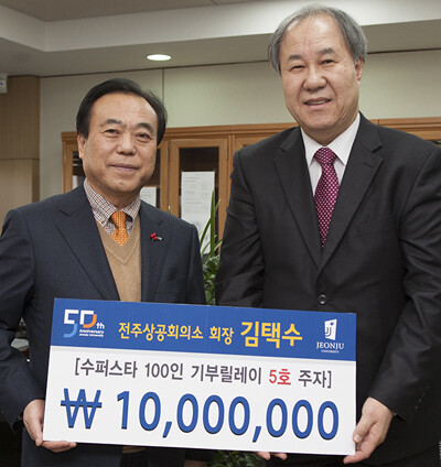 전주대는 13일 오후 김택수 전주상의 회장이 대학을 방문해 '100인 기부 릴레이 5호 주자 발전기금 전달식'에서 1천만 원의 발전기금을 기탁했다고 밝혔다.