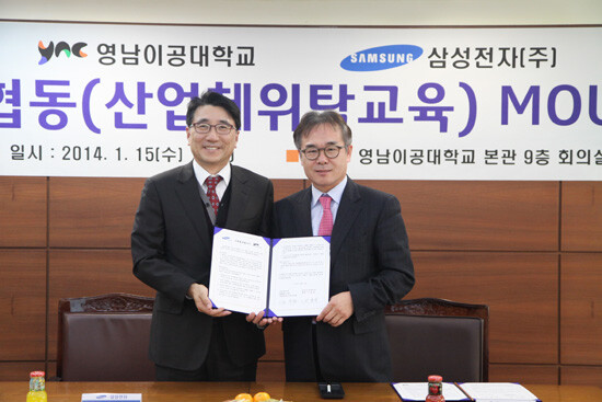 삼성전자(주)와 영남이공대는 지난 15일 구미 삼성전자 산업체위탁교육과정 신설에 대한 산학협동협약식을 가졌다. 이 자리에는 삼성전자 SMART City 지원센터장 전우헌 전무를 비롯한 삼성측 관계자들과 이호성 총장을 비롯한 보직교수들이 참석했다.