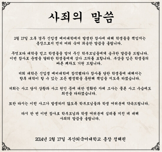 이에 정해린 부산외대 총장은 즉각 '사죄의 말씀'이라는 사과문을 발표하고 "신입생 예비대학에서 발생한 참사에 대해 학생들을 책임지는 총장으로서 먼저 머리 숙여 죄송한 말씀을 올린다"고 말했다.