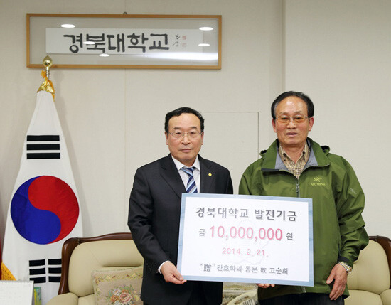 경북대 간호학과 69학번인 고순희 여사의 유가족들은 평소 고인의 유지를 따라 후배들을 위한 발전기금을 전달했다. 전달된 발전기금은 ‘간호대학기금’으로 적립되어 간호대학 발전을 위해 사용될 예정이다.