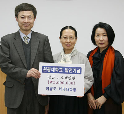 원광대학교는 이병도 치과대학장(사진 왼쪽)이 18일 학교 발전기금으로 500만 원을 기탁했다고 밝혔다.