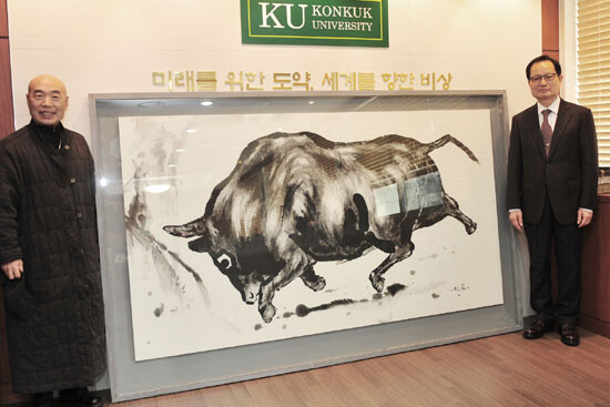 이 화백은 지난 20일 오후 건국대를 상징하는 황소의 힘찬 움직임을 포착한 150호 짜리 대형 전통 수묵화 그림 작품 ‘힘'을 송희영 총장에게 전달했다. 이 화백은 지난해 4월과 9월에도 건국대를 상징하는 황소그림을 기증한 바 있으며, 이번이 세 번째 작품 기증이다.