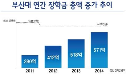 이는 지난해 518억 6천만 원보다 52억 5천만 원이 확충된 것으로, 재학생 3명 중 2명에게 1인당 388만 원(연간 추정치)의 장학금이 지원된다. 388만 원은 부산대의 2014학년도 연간 등록금인 426만 원의 91%에 해당하는 금액이다.