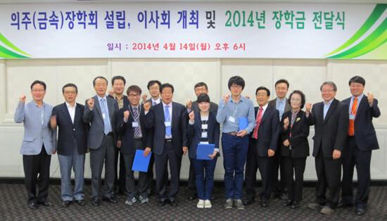 부산대학교(총장 김기섭) 금속·재료동문회(회장 신동익 ㈜스틸플라워 회장)는 이 같은 내용으로 운영되는 의주(금속)장학회를 설립하고 지난 14일 첫 이사회 및 2014년 장학금 전달식을 학내 상남국제회관 1층 문창홀에서 개최했다.