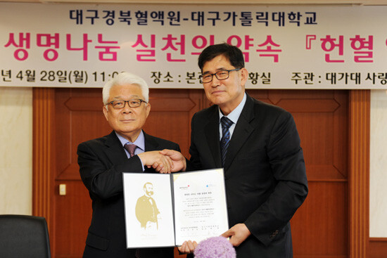 대가대는 대한적십자사 대구경북혈액원(원장 김영길)이 28일 정기적인 헌혈 참여와 선진 헌혈문화 정착을 위해 지속적으로 협력할 것을 약속하는 헌혈약정을 체결했다.