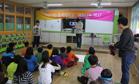 이번 행사는 동국대 경주캠퍼스가 재학생들의 재능 기부를 통해 지역사회에 기여하고, 미래의 주역인 어린이들에게 꿈과 희망을 주기 위한 취지다. 이날 봉사는 동국대 벤처창업동아리 ‘공돌이들’의 로봇 공연과 동국대 불교아동보육학과의 페이스 페인팅, 카네이션과 지갑 만들기 등의 체험활동으로 진행됐다.