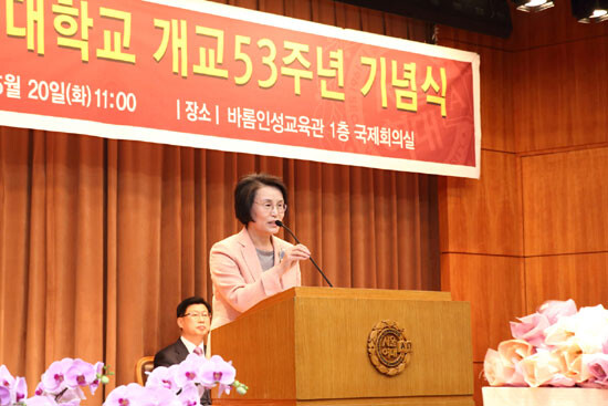 서울여대는 20일 오전 11시, 교내 바롬인성교육관 국제회의실에서 내외빈과 동문, 교수와 교직원, 학생 등 200여 명이 참석한 가운데 제 53주년 개교기념식을 개최했다.