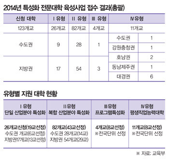 교육부(장관 서남수)가 지난 5월 8일 발표한 2014년 특성화 전문대학 육성사업 신청 접수 결과를 보면, 정부의 특성화 전문대 육성사업에는 전국 137개 전문대학 중 123개교(89.7%)가 지원했다. 이들 대학은 특성화 전문대학으로서의 체제개편과 중장기 인력양성계획을 담은 특성화사업 신청서를 제출했다. 신청대학 가운데 평생직업능력대학 8개교를 포함해 올해 78개 대학을 선정하므로 전체 경쟁률은 1.57대 1을 기록했다. 100개 대학 중 약 63개 대학이 선정되는 셈이다.