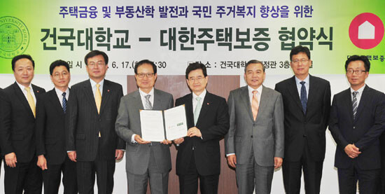 이날 오후 서울 광진구 건국대 행정관에서 열린 협약식에서 양 기관은 주택 및 부동산 금융분야의 연구 및 교류를 통해 주택금융 및 부동산학 발전을 도모하고, 국민의 주거복지 향상에 기여하기 위해 △ 공동연구및 조사 추진 △ 구성원 교육 및 교류 △ 공청회 개최 등을 상호 지원하기로 했다.