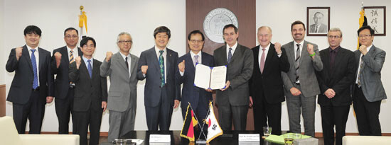 지난 24일 오전 건국대 행정관에서 진행된 이번 협약식에는 송희영 건국대 총장, 신기현 기계설계학전공 교수, 아놀드 반 질(Arnold van Zyl) 켐니츠 공과대학 총장, 레인하드 바우만(Reinhard R. Baumann) 디지털인쇄기술학과장을 비롯한 양 대학 관계자 10여 명이 참석해 학생교류에 대해 논의했다.