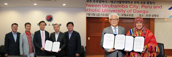 대구가톨릭대는 지난 4일 페루 우루밤바시(市)와 교류협력 양해각서를 체결했다. 연구와 교육과정 개발 증진을 위한 공동 프로젝트, 사회봉사와 인턴십을 목적으로 하는 학생교류, 교육·관광·의료·IT 분야 등의 교류협력을 약속했다.
